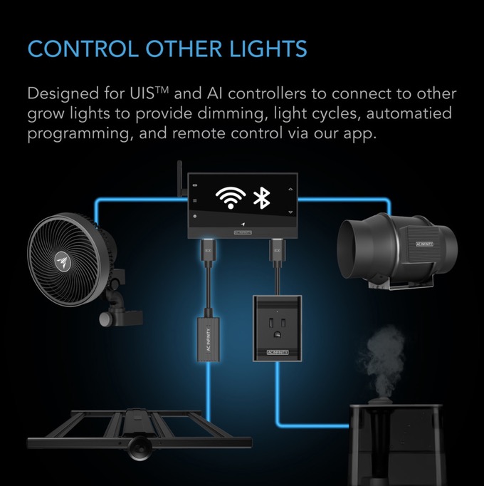 An adapter dongle designed to connect our UIS controllers to grow lights from other manufacturers. The Type-B adapter works only with grow lights with RJ11 and RJ12 connectors that use resistor dimmers; see below for compatibility list. By connecting your lighting fixture to one of our controllers, you can automate it with light cycles, scheduling, and dynamic responses to temperature and humidity. It will also join the UIS platform of smart controllers and grow equipment, all working together to create the ideal environment for your plants. Our WiFi-enabled smart controllers allow you to monitor and control your grow on your phone from anywhere while providing data charts and alert notifications via the AC Infinity app. Once your first light has connected to the controller, you can control additional RJ11 or RJ12 connector lights using that manufacturer's daisy chain method. Includes a 10-foot RJ11/12 extension cord. Compatible with our controllers with UIS connectors like CONTROLLER 69, CONTROLLER 69 WiFi, CONTROLLER 69 PRO, and Controller AI+. An additional UIS device is required to power the controller.