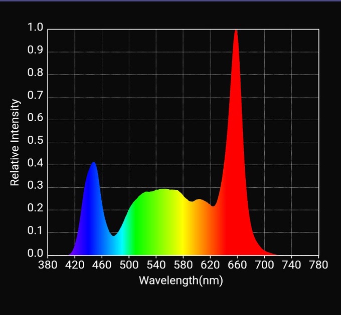 Plant-centric White spectrum with Deep Red. Red:Green:Blue ratio of 48:32:20