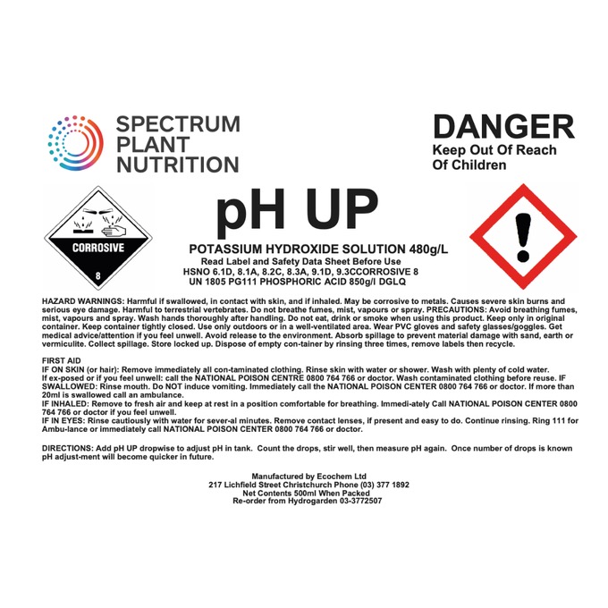 HydroGarden pH Down is very strong, potassium hydroxide at 300g/L and needs to be handled with care. If you get it on yourself or your clothes, wash it off immediately.