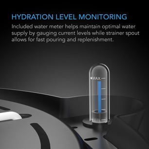 Included gauge displays the current water level while the strainer spout enables quick replenishment.