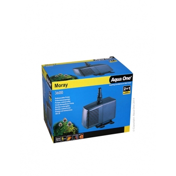 Aqua One Moray 3600 Submersible Pump – Comes with instruction booklet, 20 & 25mm screw in tubing attachments, elbow, 4 suction cup mounting bracket and strainer.